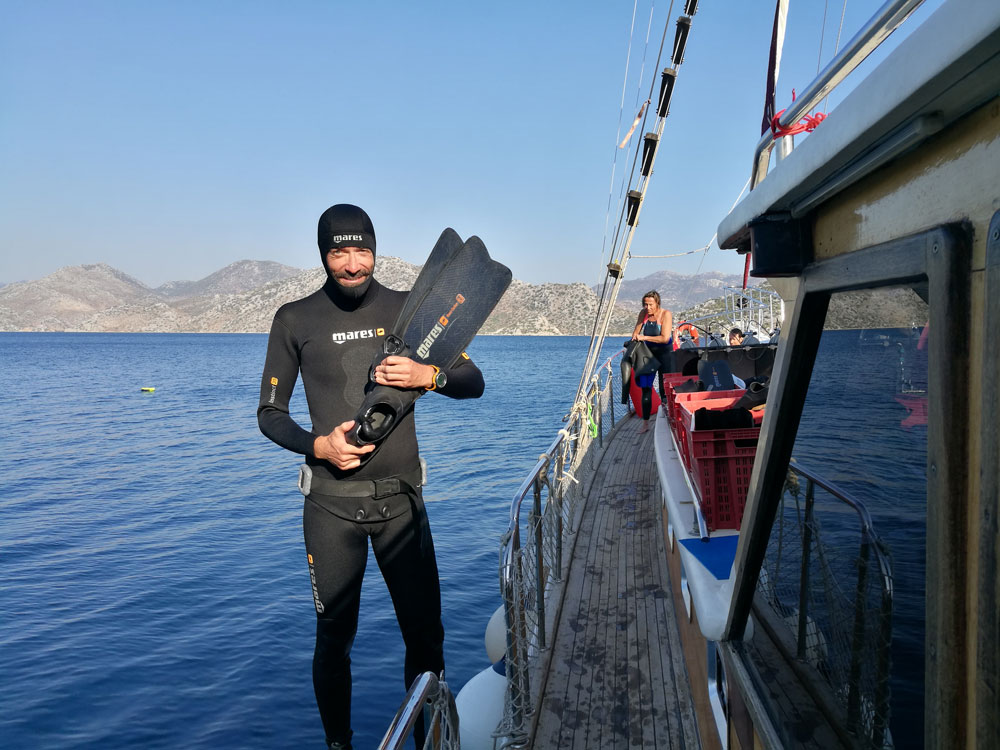 Seit 2015 haben wir Freitaucher auf unserer traditionellen türkischen Gulet untergebracht. Wenn sie unser Schiff buchen, schätzen sie den Vorteil, dass sie ihre Ausrüstung nicht zu den Tauchplätzen tragen müssen. Die Freitaucher lagern ihre Ausrüstung in den Plastikboxen an Bord und gehen direkt von unserem Schiff aus ins Wasser. Sie machen ihre Übungen maximal 100 Meter entfernt von OKYANUS JD.